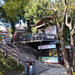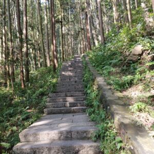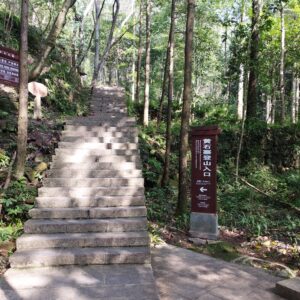 尾根に沿って木々の間に延々と階段が続く。膝を痛めないようにゆっくりと登る。頂上まで1時間半の道程だ。昨日張家界のホテルでもらった地図とスマホの百度地図を見比べながら進んだ。スマホは現在位置がわかるので本当に便利。
