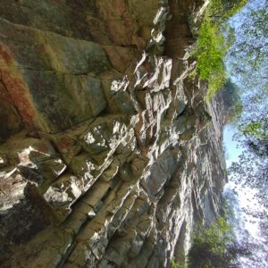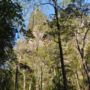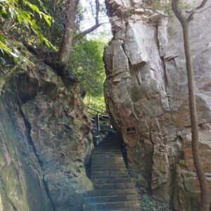 黄石寨の遊歩道を1時間強で巡ったあと、下山を始めた。下山路は路面が苔や落葉で覆われた階段が多く、濡れていると滑りやすいので注意して歩いた。この道は頂上から谷まで一気に高度を下げ、その後は谷に沿ってゆっくりと下っている。途中、見上げるような絶壁の直下を通った。